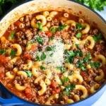 - 1️⃣Cook the beef and aromatics: In a large skillet over medium-high heat, add the ground beef, chopped onion, and minced garlic. Cook for 5-7 minutes, stirring frequently, until the beef is browned and the onion is translucent. Drain any excess fat if needed.2️⃣Add liquids and seasonings: Stir in the stewed tomatoes (with their juice), 1 can of water, dried parsley, dried oregano, red pepper flakes, salt, and freshly ground black pepper. Mix everything well.3️⃣Incorporate the pasta: Bring the mixture to a boil, then add the elbow macaroni. Reduce the heat to low, cover the skillet, and let it simmer for about 15 minutes, stirring occasionally to prevent the pasta from sticking to the bottom of the pan.4️⃣Serve: Once the pasta is tender and the flavors are melded, remove the skillet from heat. Serve hot, topped with freshly grated Parmesan cheese. Adjust seasoning with additional salt or pepper if needed.