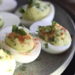 - Fill the eggs. Use a spoon, baggie (with a small hole in the tip, see video), or a piping bag to add filling to the center of each egg white. Sprinkle the top of your eggs with additional cilantro and cayenne pepper. Serve immediately (Note 5) and enjoy!