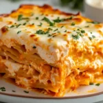 - 1️⃣Prepare the Cheese Mixture:In a large mixing bowl, combine softened cream cheese, ranch seasoning, buffalo sauce, milk, cheddar cheese, and 1 ½ cups of the mozzarella cheese. Mix until smooth and well incorporated.2️⃣Cook the Lasagna Noodles:Bring a large pot of salted water to a boil. Cook the lasagna noodles according to package instructions until al dente. Drain and lay flat on a clean surface to prevent sticking.3️⃣Assemble the Lasagna:Spread a thin layer of the cheese mixture on the bottom of a 9×13-inch baking dish.Lay down a layer of lasagna noodles.Spread another layer of the cheese mixture on top of the noodles, followed by a layer of shredded chicken.Repeat the layers, ending with a layer of the cheese mixture on top. Sprinkle the remaining ½ cup of mozzarella cheese evenly over the final layer.4️⃣Bake:Cover the baking dish tightly with aluminum foil and bake in a preheated oven at 375°F (190°C) for 45 minutes.Remove the foil and bake uncovered for an additional 10 minutes, or until the cheese on top is bubbly and golden.5️⃣Rest and Serve:Let the lasagna rest for 8–10 minutes before slicing to allow the layers to set. Garnish with optional toppings such as ranch dressing drizzle, chopped green onions, or blue cheese crumbles.