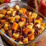 A warm and comforting Apple Butternut Squash Bake featuring tender squash, sweet apples, cinnamon, raisins, and pecans — perfect for fall and holiday meals.