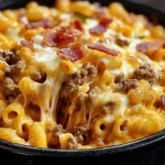 - Add minced garlic and cook for an additional minute until fragrant.Add the ground beef and cook until browned, breaking it into small pieces as it cooks. Drain any excess fat and season with salt and pepper to taste.3️⃣Make the Cheese Sauce:In a medium saucepan, heat the heavy cream over medium heat.Gradually whisk in the cheddar and mozzarella cheese until melted and smooth. Season with salt and pepper if needed.4️⃣Preheat the Oven:Preheat your oven to 375°F (190°C). Grease a large baking dish with cooking spray or a little olive oil.5️⃣Combine Ingredients:In a large mixing bowl, combine the cooked pasta, beef mixture, ketchup, mustard, and cheese sauce. Mix well to ensure everything is evenly coated.6️⃣Assemble and Bake:Transfer the pasta mixture into the greased baking dish.Sprinkle additional cheese, turkey bacon bits, or chopped pickles on top if desired.Bake in the preheated oven for 20 minutes, or until the cheese is bubbly and golden.7️⃣Serve:Remove from the oven and let the dish cool for a few minutes before serving. Enjoy your cheesy, savory delight!