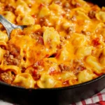 - Stir and crumble the beef as it cooks, ensuring the onions soften.Once the beef is fully browned, drain any excess grease.2️⃣Season the Beef:Add the salt, pepper, and minced garlic to the skillet. Stir well and cook for one more minute to release the garlic’s aroma.3️⃣Add Tortellini and Base Ingredients:Stir the frozen cheese tortellini into the skillet.Add the condensed cheddar soup and the Rotel (with its juices), stirring until well combined.4️⃣Create the Sauce:Pour in the milk, yellow mustard, and ketchup. Stir thoroughly.Bring the mixture to a boil.5️⃣Simmer the Tortellini:Reduce the heat to medium-low and cover the skillet with a lid.Allow the tortellini to simmer for 5-6 minutes, stirring once halfway through to prevent sticking.6️⃣Melt the Cheese:Remove the lid and stir well to combine everything.Sprinkle the shredded cheddar cheese evenly over the top.Place the skillet under the broiler for 2-3 minutes, or until the cheese is melted and golden brown. Alternatively, you can cover the skillet with the lid and let the cheese melt on the stovetop.7️⃣Rest and Serve:Remove the skillet from the oven and let it rest for a few minutes.Serve hot and enjoy your cheeseburger-inspired tortellini dish!