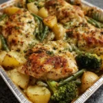 Cheesy Garlic Herb Chicken Bake is a cozy one-pan dinner featuring juicy chicken breasts, baby potatoes, green beans, and broccoli baked together with garlic, herbs, and melted mozzarella cheese. It’s an easy, family-friendly comfort meal ready in an hour.