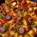 Crispy potatoes and kielbasa coated in creamy cheese sauce with bell peppers for a hearty, flavorful comfort dish.