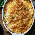 A comforting, cheesy casserole with a rich French onion flavor, topped with crispy homemade fried onions. Perfect for gatherings, holidays, or a hearty family dinner!