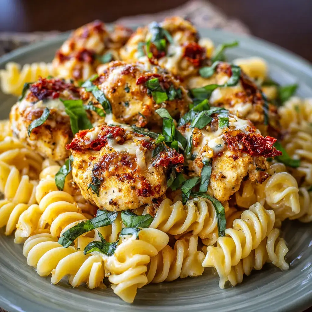 - Plate the creamy sun-dried tomato rotini and top generously with cheesy Tuscan chicken bites. Finish each plate with a sprinkle of fresh basil before serving.