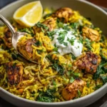 A one-pan turmeric chicken and rice bowl with spinach and aromatics, designed for clean eating, recovery, and easy weeknight meals.