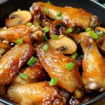 - 2️⃣Prepare the skillet:Heat a tablespoon of oil in a large skillet or wok over medium heat. Place the marinated chicken wings skin-side down in the skillet.3️⃣Cook the chicken:Fry the chicken wings for about 5-7 minutes on each side, or until they are golden brown and cooked through.4️⃣Add the mushrooms:Add the sliced mushrooms to the skillet. Stir and cook for an additional 3-5 minutes, or until the mushrooms have softened and released their juices.5️⃣Season the dish:Adjust the flavor with a little more salt and black pepper if needed. Stir everything well to coat evenly with the sauce.6️⃣Garnish and serve:Sprinkle the chopped green onions over the dish. Give it a quick stir and serve immediately.
