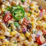 - In a large bowl, combine the cooled macaroni, corn, black beans, bell peppers, red onion, and cilantro. Pour the creamy dressing over the mixture and toss gently to coat everything evenly.