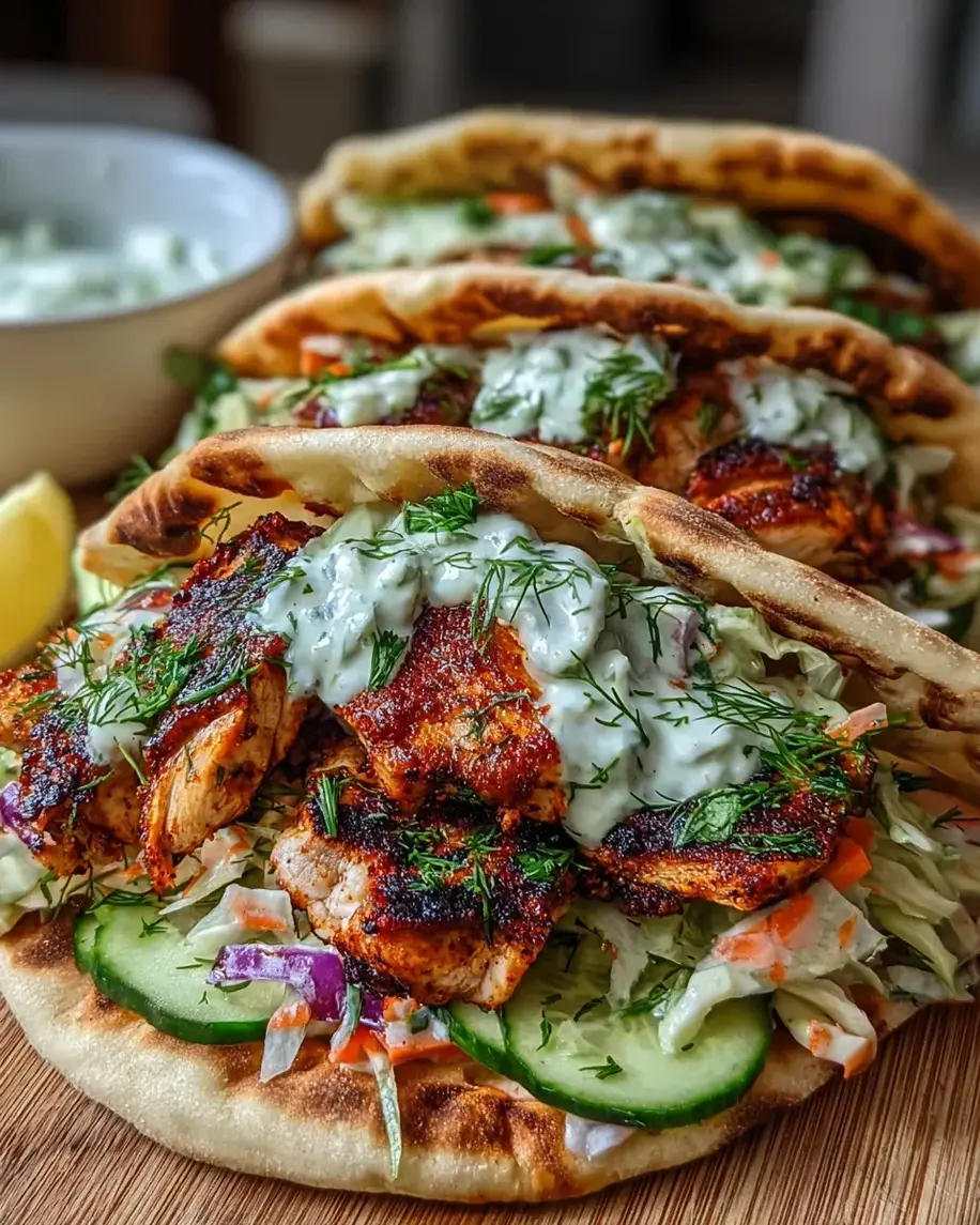 Flavor-packed chicken pitas filled with juicy marinated chicken and creamy herby ranch slaw, perfect for a delicious meal.