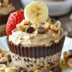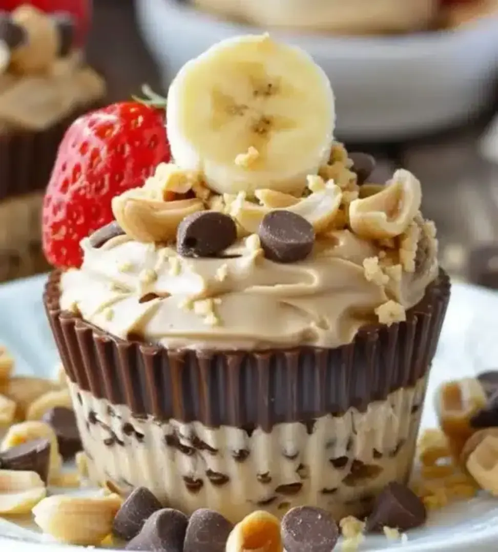 - Assemble the Cups:Remove chocolate shells from the freezer.Spoon the peanut butter mixture into the chocolate cups, filling them almost to the top.Place a banana slice on top of each cup, followed by a strawberry half.Sprinkle with chopped peanuts and extra chocolate chips.