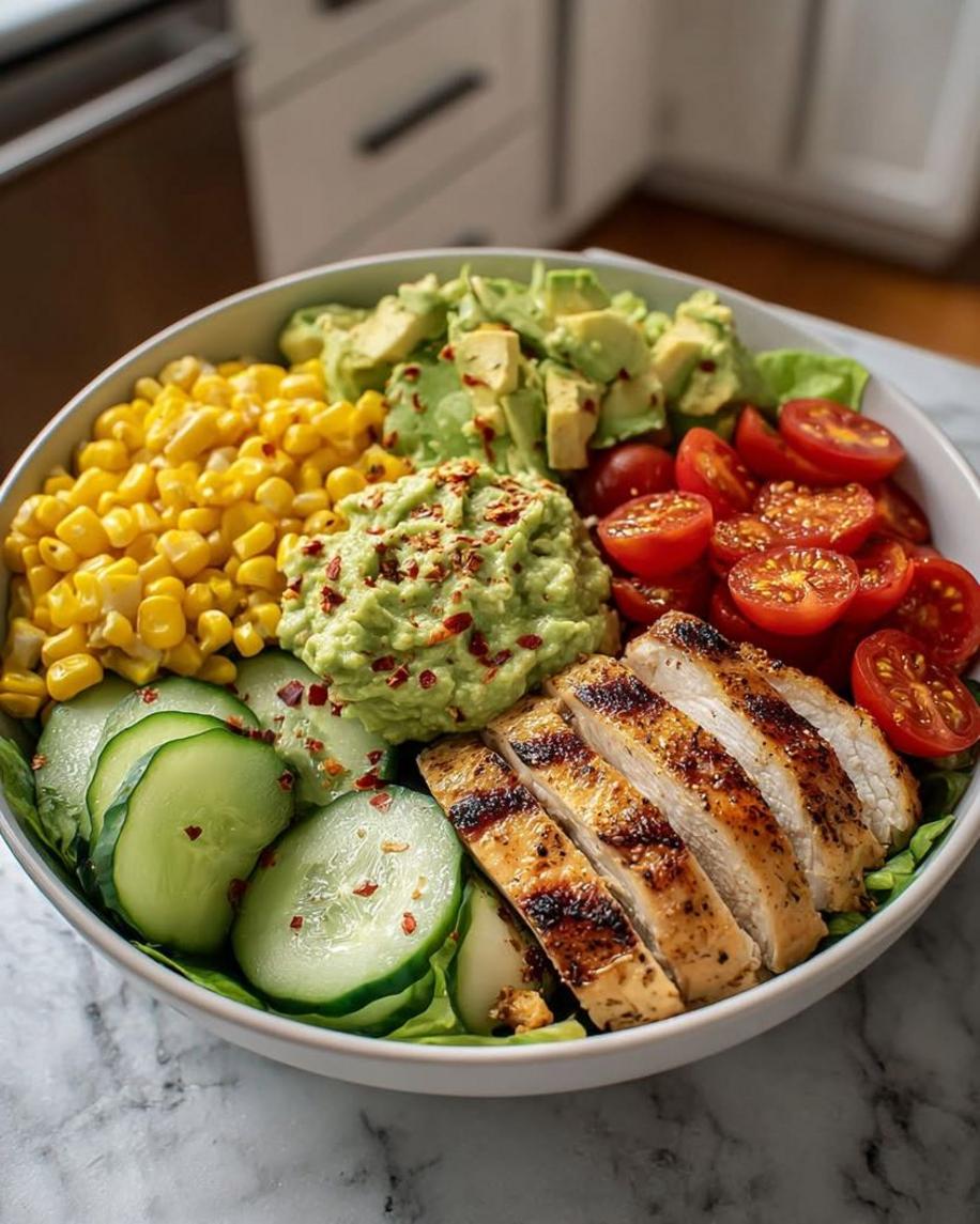 The flavors in this healthy chicken bowl with creamy guac & fresh veggies are a symphony of fresh and vibrant notes. The grilled chicken offers a juicy, slightly smoky texture that contrasts beautifully with the cool, creamy guacamole—made extra indulgent by mashing ripe avocados with zesty lime and garlic. Each bite bursts with the crisp crunch of cherry tomatoes, the refreshing snap of sliced cucumber, and the mild bite of red onion, all nestled on a bed of mixed greens. Aromas of grilled meat and citrusy guac fill the air, creating an inviting, restaurant-quality experience right in your kitchen. It’s a chicken bowl recipe that feels light yet filling, with the creamy guac chicken element adding a luxurious creaminess that elevates every forkful.