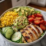 The flavors in this healthy chicken bowl with creamy guac & fresh veggies are a symphony of fresh and vibrant notes. The grilled chicken offers a juicy, slightly smoky texture that contrasts beautifully with the cool, creamy guacamole—made extra indulgent by mashing ripe avocados with zesty lime and garlic. Each bite bursts with the crisp crunch of cherry tomatoes, the refreshing snap of sliced cucumber, and the mild bite of red onion, all nestled on a bed of mixed greens. Aromas of grilled meat and citrusy guac fill the air, creating an inviting, restaurant-quality experience right in your kitchen. It’s a chicken bowl recipe that feels light yet filling, with the creamy guac chicken element adding a luxurious creaminess that elevates every forkful.