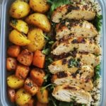 - Divide quinoa, roasted veggies, and sliced chicken into meal prep containers.