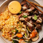 - Build the bowls & serve. Evenly divide the cooked steak and sautéed veggies into shallow bowls, along with fried rice. Finish off bowls with a drizzle of store-bought Yum Yum sauce (or feel free to serve it on the side) to complete these hibachi steak bowls. Enjoy!