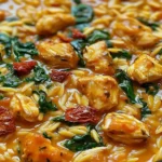 The magic of Marry Me Chicken with Risoni – Easy One-Pan Dinner lies in its irresistible aromas and textures that dance on your palate. Picture tender chicken cubes seared to golden perfection, enveloped in a rich, creamy sauce that hugs every piece of risoni (orzo) like a warm embrace. The sun-dried tomatoes add a tangy burst, while fresh spinach wilts in for a nutritious pop of color and earthiness. Every bite delivers a harmonious blend of savory Italian seasoning and paprika, creating a dish that’s not just filling but also decadently comforting, making it a standout among one-pan dinners.