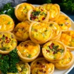 This mini quiche recipe is bite sized pastries filled with eggs, cheese, meat and vegetables. An elegant appetizer or brunch option that can be customized in so many different ways to suit your tastes.