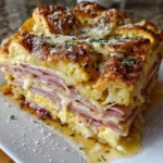A delicious and hearty Monte Cristo Breakfast Casserole that combines layers of ham, turkey, Swiss cheese, and bread, baked to perfection.