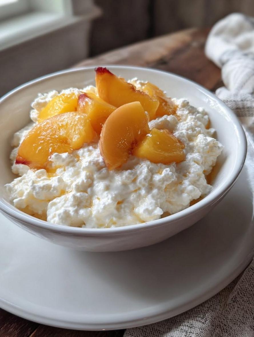 A simple, refreshing breakfast bowl featuring creamy cottage cheese topped with sweet, juicy peaches and optional nutritious add-ins for a fruity, filling, and protein-packed start to your day.