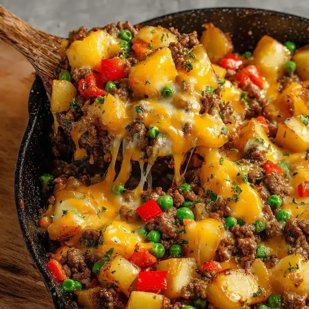 A hearty one-pan potato skillet with ground beef, potatoes, cheddar cheese, and vegetables. Comfort food ready in just 40 minutes, perfect for busy nights or family dinners.