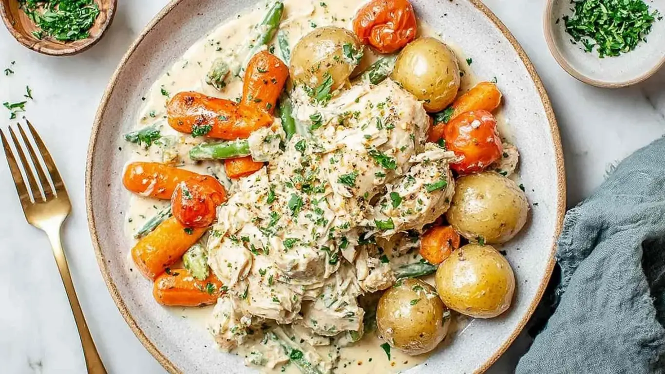 - Shred the chicken directly in the crockpot using two forks, then stir everything together so the sauce coats the potatoes and carrots. Taste and adjust seasoning. Garnish with chopped fresh parsley and cracked black pepper before serving.