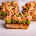 Crispy rice salmon is my viral favorite go-to appetizer dish for a balance between crispy and creamy. Pan-fried crispy sushi rice cakes topped with smashed avocado and spicy salmon, are so easy and delicious! Top the crispy rice off with a thin slice of jalapeño, a little dash of sriracha, and sesame seeds for spicy kicks!