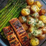 This dish delights the senses with the golden crunch of crispy potatoes, the tender, flaky texture of seared salmon, and the gooey, melted cheese coating the vibrant green asparagus. Each bite offers a symphony of flavors: the rich, savory notes of salmon enhanced by a hint of char from searing, the earthy crispiness of potatoes that rival deep-fried versions, and the creamy, nutty taste of cheese-baked asparagus that adds a satisfyingly indulgent finish. The aromas wafting from your oven—warm, herbaceous, and inviting—will have everyone rushing to the table, making this Salmon and Vegetable Recipe a feast for both eyes and palate.