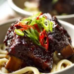 Tender, slow-cooked beef ribs glazed in a sweet and savory Asian BBQ sauce, served over slurpy udon noodles for a comforting, flavorful meal.