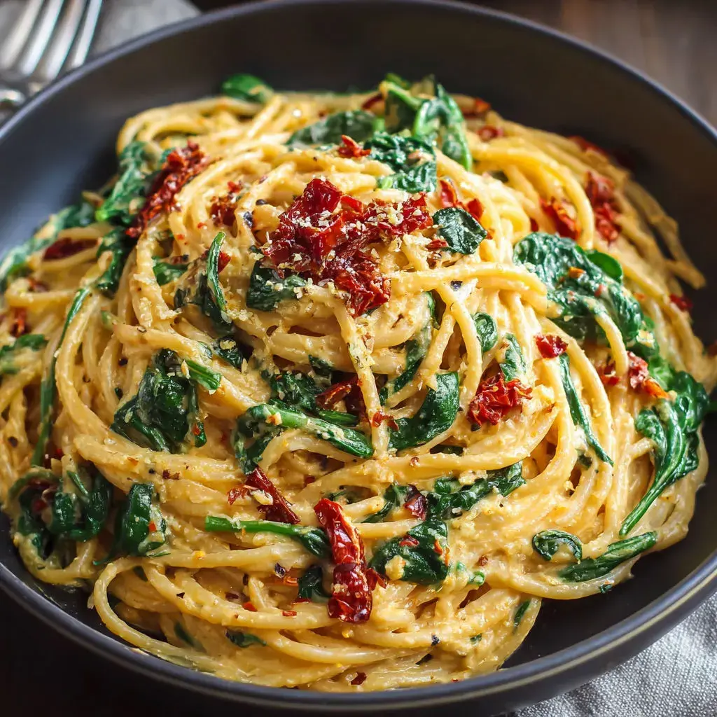 Can I make Spaghetti Spinach Sun-Dried Cream vegan? Yes, substitute parmesan with nutritional yeast and use coconut or oat cream for a dairy-free version while keeping it creamy.