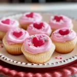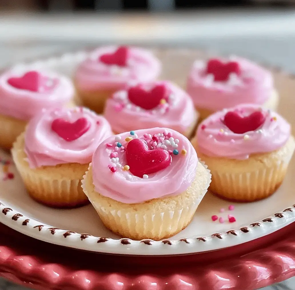 Once cooled, fill each cup with about ½ tsp strawberry jam and pipe 1 tsp pink buttercream frosting on top, then add heart and round sprinkles for decoration.
