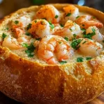 - Taste and adjust the seasoning as needed. Stir in the fresh parsley and a squeeze of lemon juice for brightness, if desired.3️⃣ Assemble the Bread BowlsLadle the hot seafood soup into the toasted bread bowls.Garnish with additional parsley or a sprinkle of Old Bay seasoning for extra flavor.4️⃣ Serve and EnjoyServe immediately, with the tops of the bread rolls on the side for dipping. Enjoy the creamy soup and edible bread bowl together for a comforting and satisfying meal.