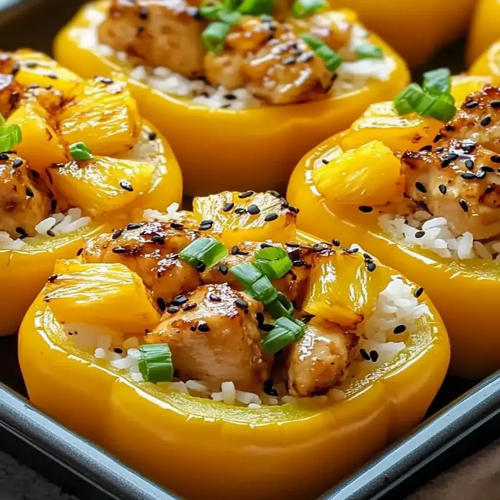 These Teriyaki Pineapple Chicken Stuffed Peppers are a vibrant and flavorful dish combining sweet pineapple, savory teriyaki chicken, and fluffy jasmine rice—all baked inside tender yellow bell peppers for a satisfying and customizable meal.
