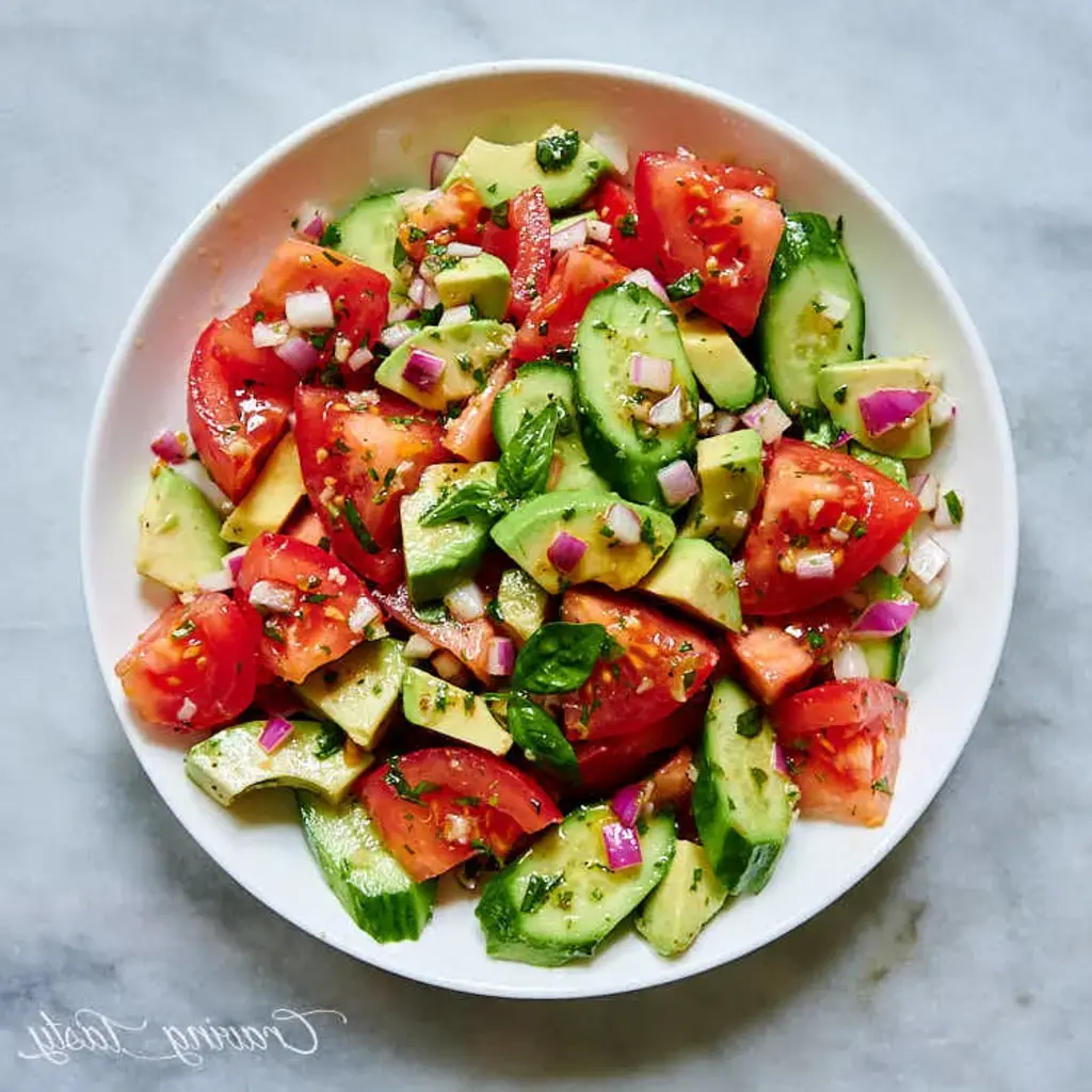 Delicious avocado, tomato and cucumber salad that is full of rich, intense summer flavors. The bright, tangy and slightly sweet dressing makes this salad delightful. #summersalad #italiantomatocucumbersalad #italiansalad #avocadosalad #tomatosalad #avocadotomatosalad