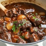 - Stir in the tomato paste and cook until darkened, about 1-2 minutes. Sprinkle with the flour, stir to coat, and cook for 1 minute to eliminate the raw taste.6️⃣Deglaze and Simmer:Pour in the red wine, scraping up any browned bits from the bottom of the pot. Add the beef broth, thyme, bay leaves, and 1/2 tsp kosher salt.Return the beef, turkey bacon, and any accumulated juices to the pot. Stir to combine and bring to a simmer over medium-high heat.7️⃣Bake:Cover the pot with a tight-fitting lid and transfer to the oven. Cook for about 2 hours, until the beef is fork-tender.8️⃣Cook Onions and Mushrooms:About 30 minutes before the beef is ready, melt the butter in a skillet over medium heat.Add the pearl onions, mushrooms, 1/2 tsp kosher salt, and 1/4 tsp black pepper. Cook, stirring occasionally, until tender and lightly browned, 12-15 minutes.9️⃣Finish the Stew:Remove the pot from the oven and discard the bay leaves and thyme stems.Stir in the cooked onions and mushrooms. Taste and adjust seasoning with more salt and pepper if needed.🔟Serve:Garnish with chopped parsley if desired. Serve hot over egg noodles, mashed potatoes, or alongside crusty bread.