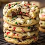 Gently fold in the white chocolate chips, dark chocolate chips, and holiday sprinkles using a spatula or wooden spoon. Distribute them evenly throughout the dough. You want to see those colorful specks and melty pockets of chocolate!